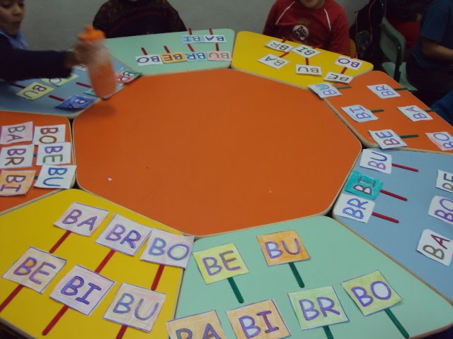 A cada palavra dita pela professora com ba, be, bi, bo, bu, br no início, meio e fim das palavras, os alunos devem ser capazes de identificar o som da sílaba e erguer a plaquinha correspondente.